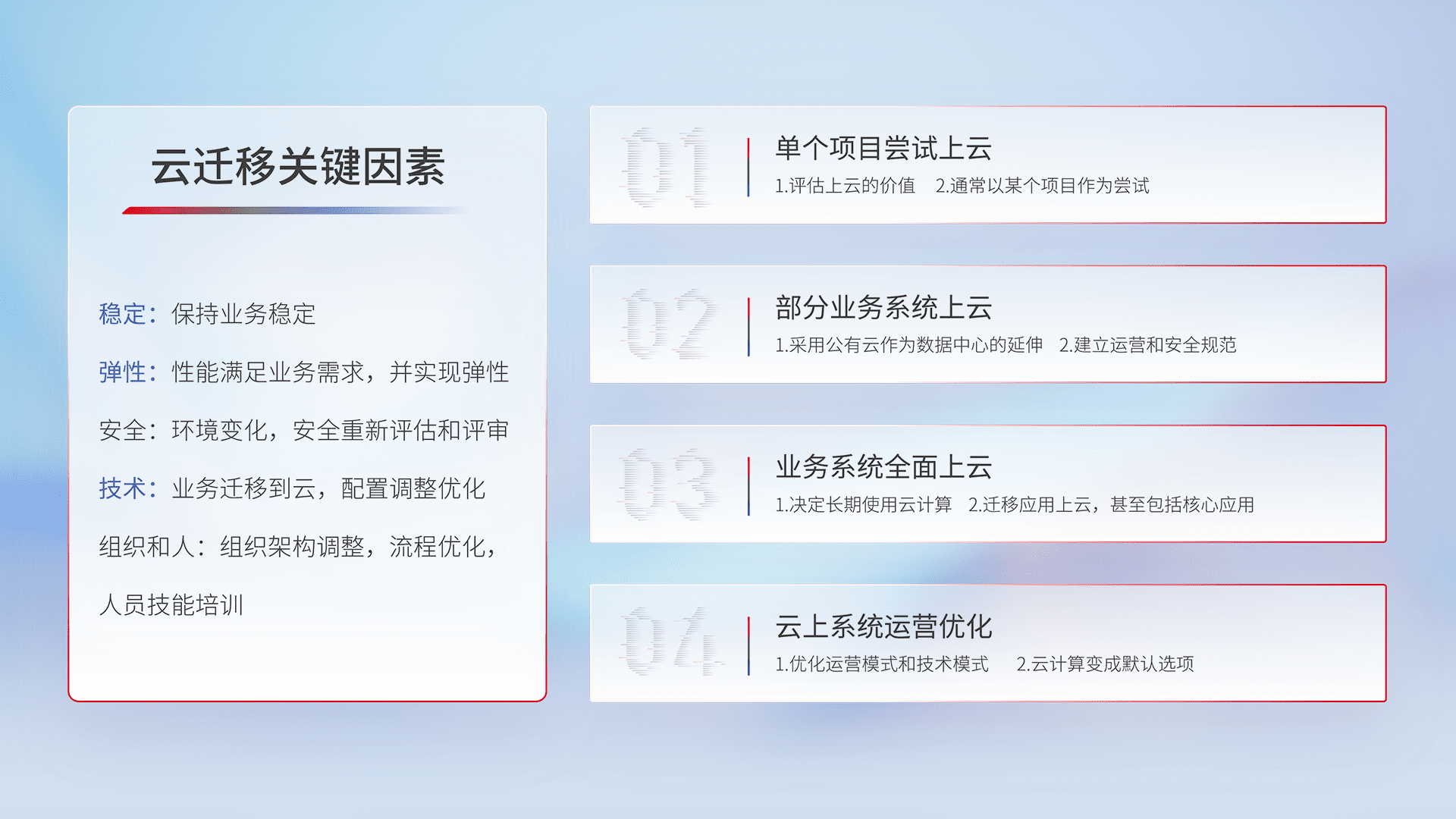 结合实际业务,,,从规划设计、、云平台选型、、云原生改造、、数据迁移、、、集成交付,,,迁移全过程为客户识别最佳上云路径,,,做好风险识别管理,,,,设计网络架构、、、、身份权限、、、安全审计合规、、操作审计、、日志审计、、、监控告警策略、、多站点容灾设计等,,,,对云上基础设施进行整体规划,,,,提升IT治理水平,,,,以满足弹性、、、、高可用、、、高性能的需求。。。。