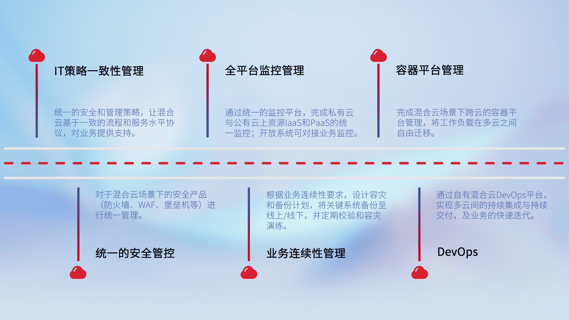 通过多云纳管,,以统一的资源数据模型把客户的云资源进行抽象和封装,,,进而实现对多云资源的统一操作,,,,保障云资源管理的可靠性、、稳定性与可用性。。量身定制化运维内容,,配置、、、开发运维、、、补丁管理、、、、备份、、、监控、、、、认证和访问管理、、审计和日常巡检等,,保障在用云过程中的可靠度,,稳定度以及高可用率。。。。