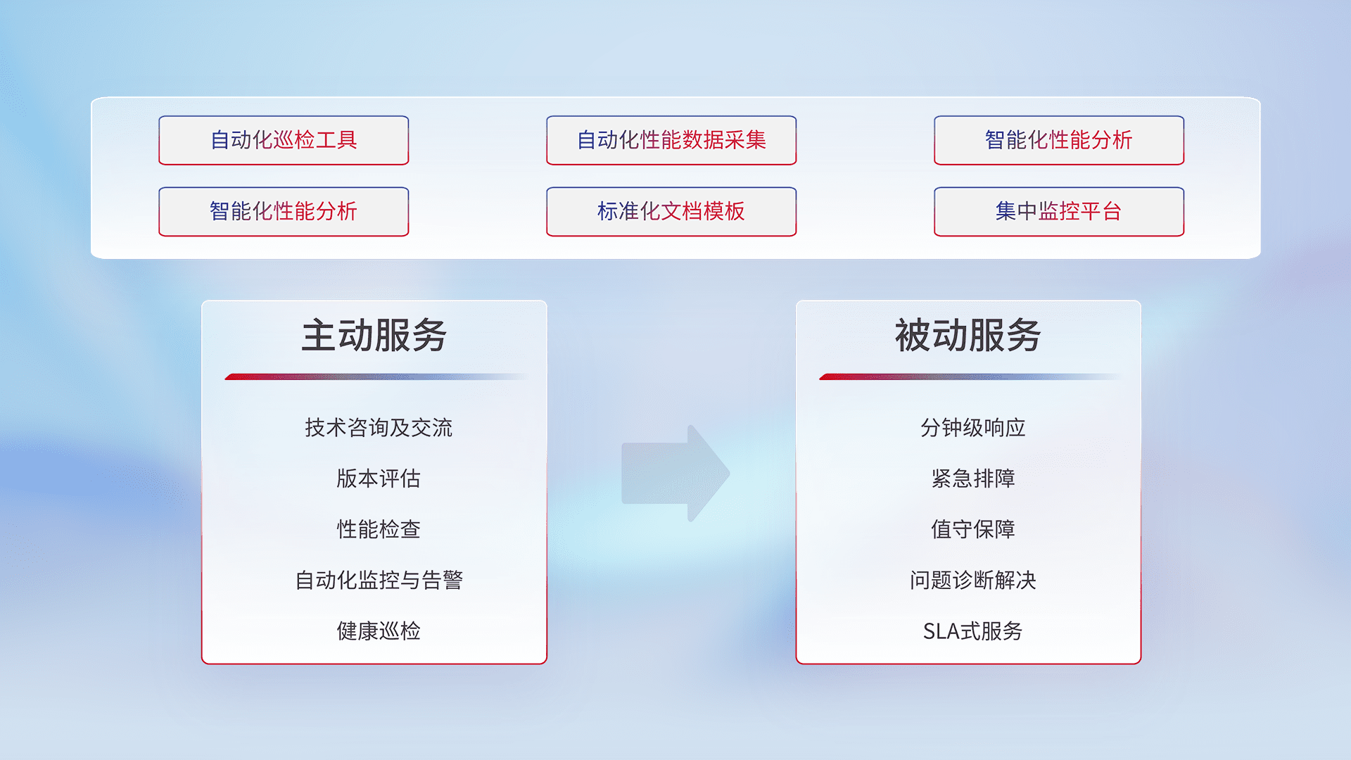 智能化工具和标准化文档,,,保障服务质量,,,,提供主动服务(包含技术咨询、、、、版本评估、、、性能检查、、、、自动化监控与告警、、、、健康巡检)和被动服务包含(分钟级响应、、紧急排障、、值守保障、、、问题诊断解决、、、SLA服务)。。。